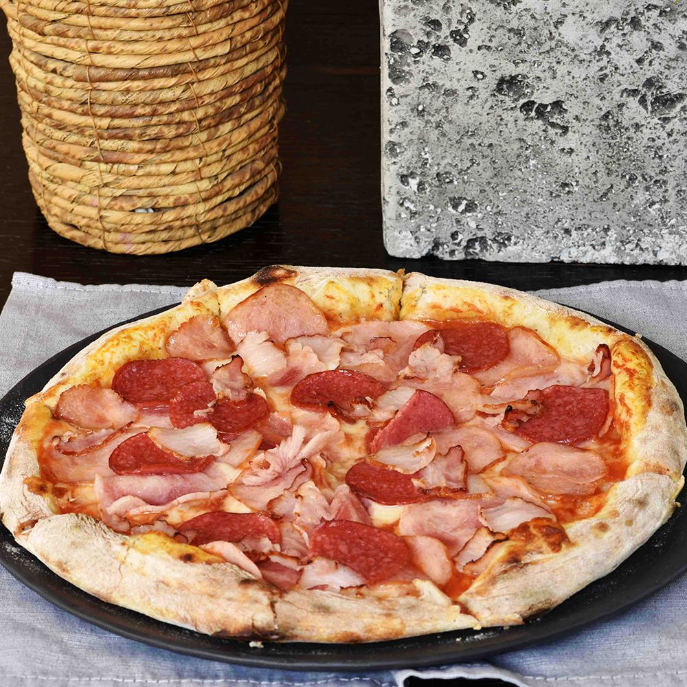 Пицца с салями , ветчиной,беконом,копчёнными колбасками