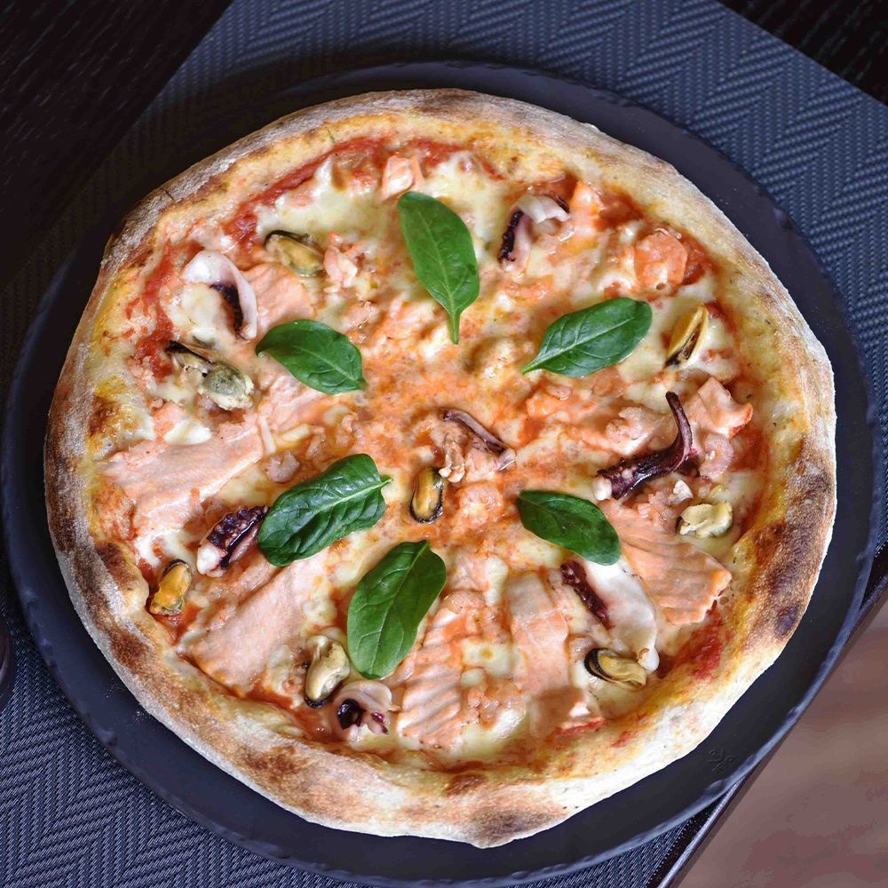 Пицца с морепродуктами, сыром моцарела, с тигровыми креветками, мидиями, семгой и осьминогом