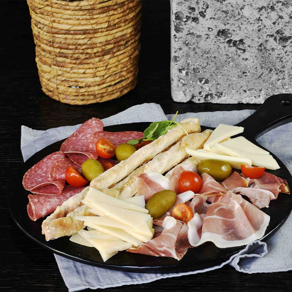 Прошутто, салями, моцарелла, помидоры, оливки, пармезан, гриссини