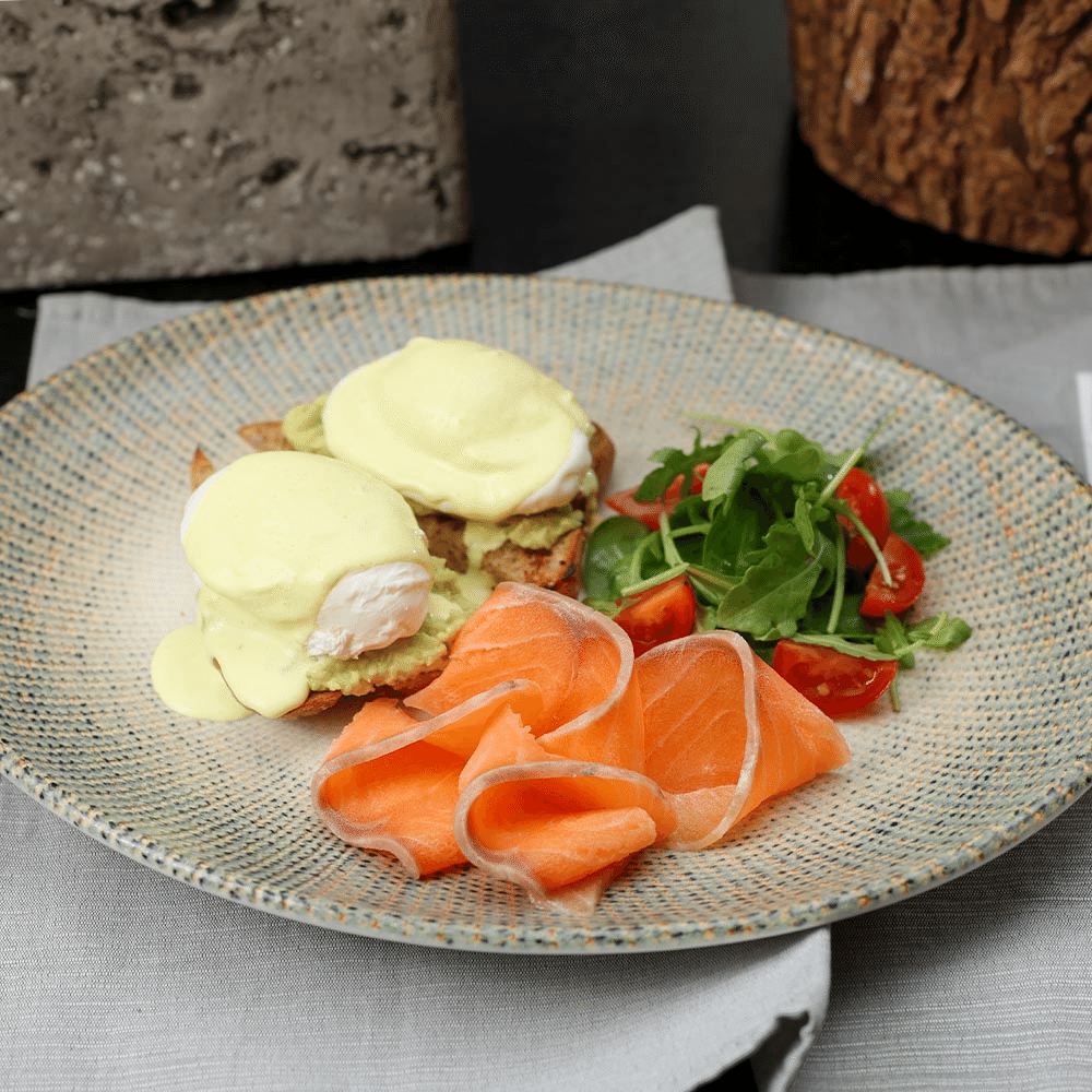 Пашот с лемонграссовым сливочным соусом, гуакамоле и слабосолёным лососем, подаётся с микс-салатом, черри, ржаным хлебом и зелёным маслом