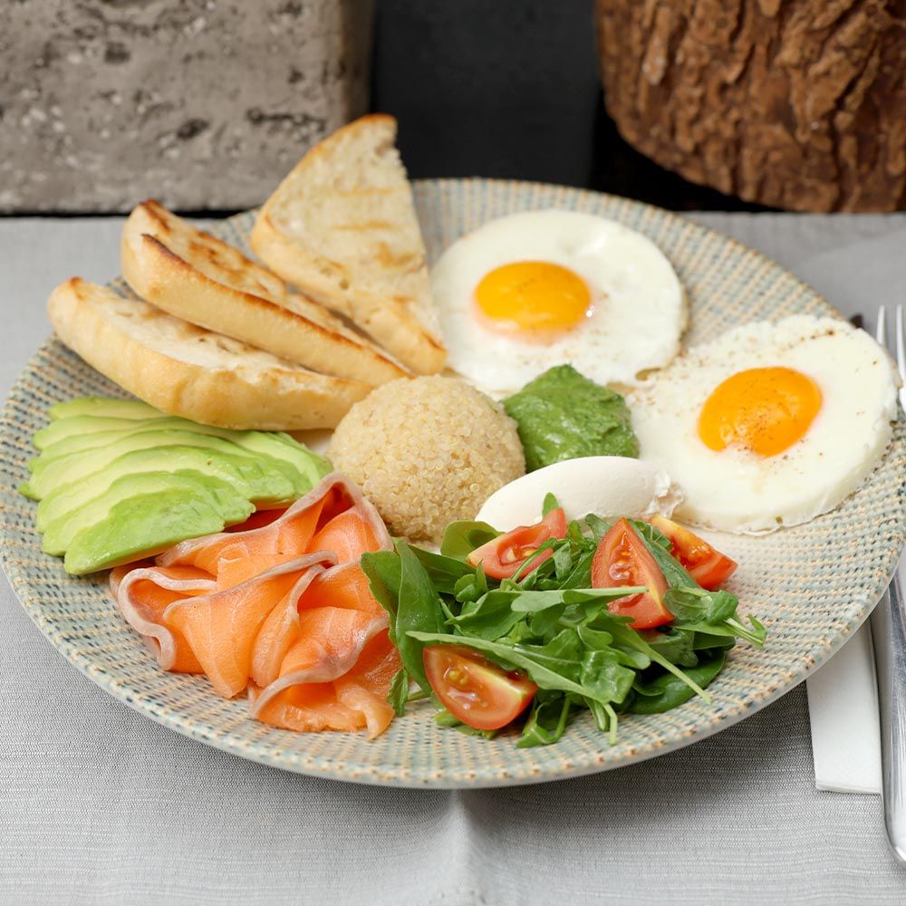 Яйца с авокадо, крем-сыром, киноа и сёмгой, салатом, черри и булкой