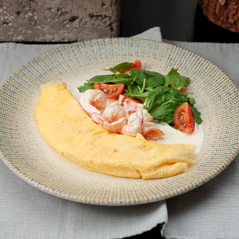 Омлет с креветками в сливочно-лемонграссовом соусе, подаётся с салатным миксом, черри и зелёным маслом